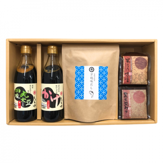 国産丸大豆醤油、かけ醤油 各360ml、米こうじみそ、黒大豆みそ 各400g、万能味だし(10g×10袋入)